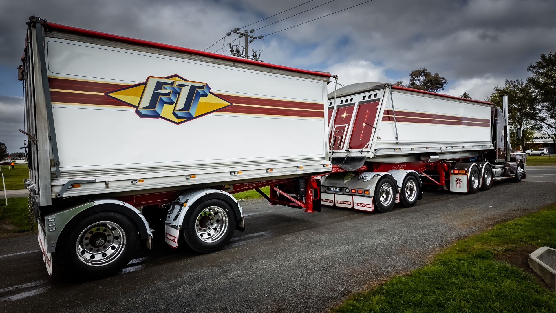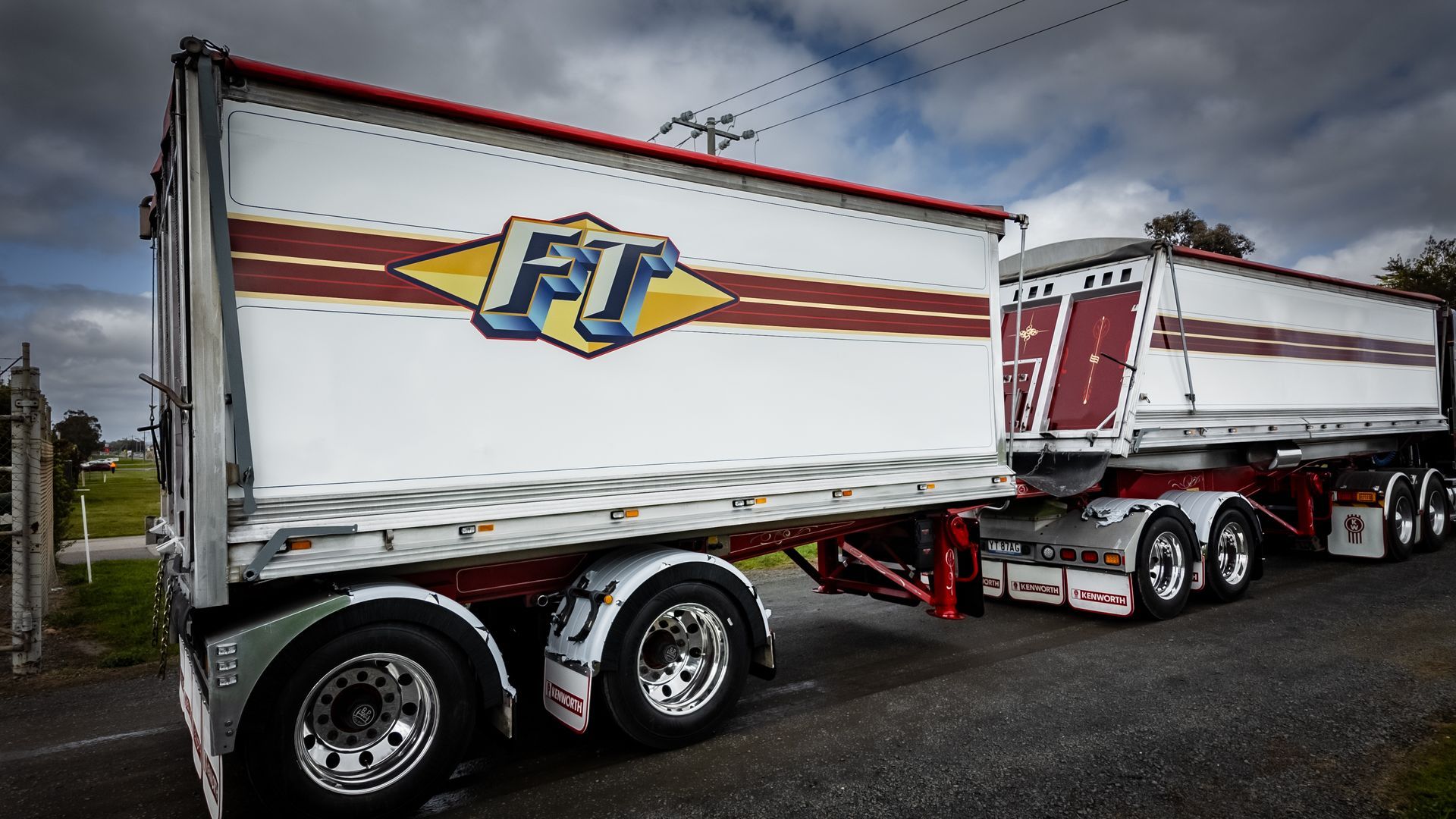 Tipper sides wrapped in white with branding lines and scrolls for Freeman’s Transport